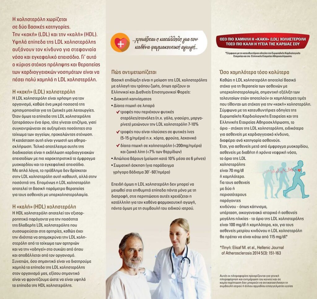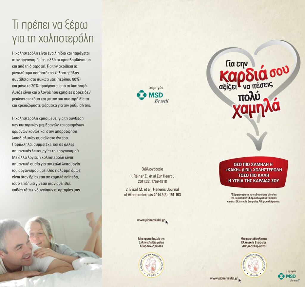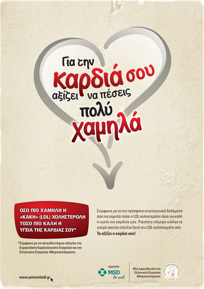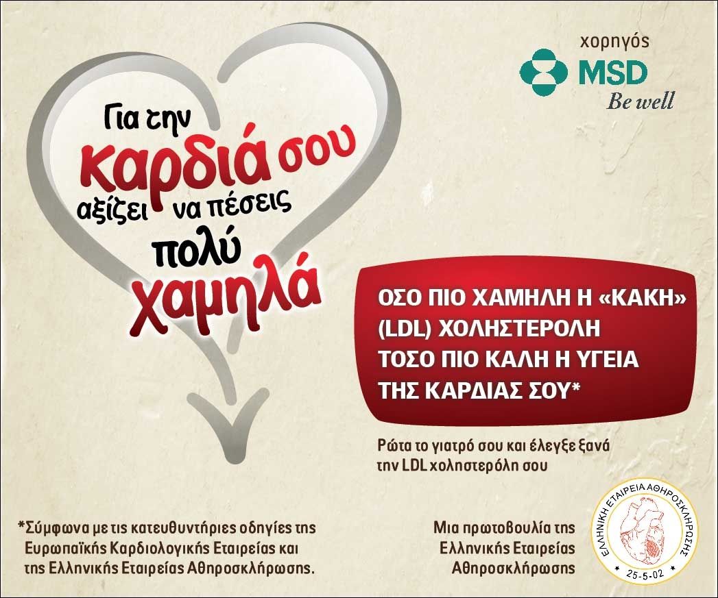 Με σκοπό την ενημέρωση και ευαισθητοποίηση του κοινού για τη διατήρηση των φυσιολογικών επιπέδων της LDL (κακής) χοληστερόλης που αποτελεί τον κύριο στόχο πρόληψης των καρδιαγγειακών νοσημάτων, η Ελληνική Εταιρεία Αθηροσκλήρωσης με τη στήριξη της φαρμακευτικής εταιρείας MSD, πραγματοποίησε το 2015 εκστρατεία ενημέρωσης με τίτλο “Για την καρδιά σου αξίζει να πέσεις πολύ χαμηλά”. Όπως τονίζει το κεντρικό μήνυμα της εκστρατείας: Όσο πιο χαμηλή η “κακή” χοληστερόλη, τόσο πιο καλή η υγεία της καρδιά σου.